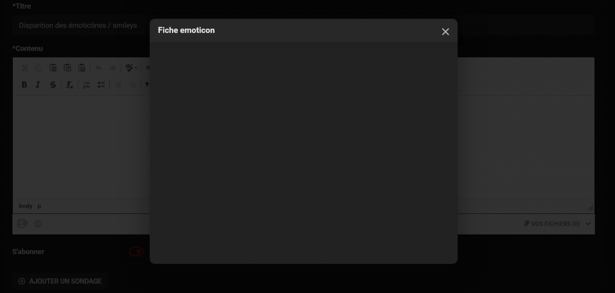 Depuis hier j'ai un souci avec l'option "Emoticon". La petite fenêtre apparaît mais elle reste noire et je ne peux voir aucun smiley. Quand je passe la souris dessus, le curseur change de forme ce qui m'indique que les smileys sont présents mais invisibles. Je peux en sélectionner à l'aveuglette mais vu que je ne connais pas leur emplacement par coeur...