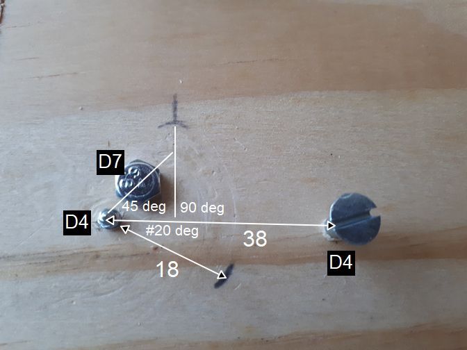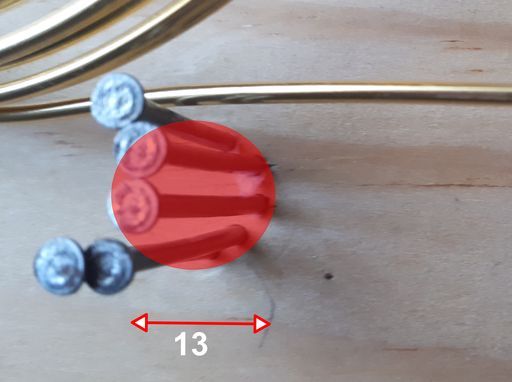 Comme support, j'ai utilisé une caisse de vin mais n'importe quel support en bois fait l'affaire. Quelques pointes, vis et écrous suffisent pour construire le guide (prévoir également une perceuse avec une mèche de 4mm). La photo indique les dimensions. Ne pas oublier de marquer les repères, surtout celui à 18 mm qui est très important. Pour former le demi-cercle de diamètre 13mm, utiliser 4 ou 5 pointes (photo).