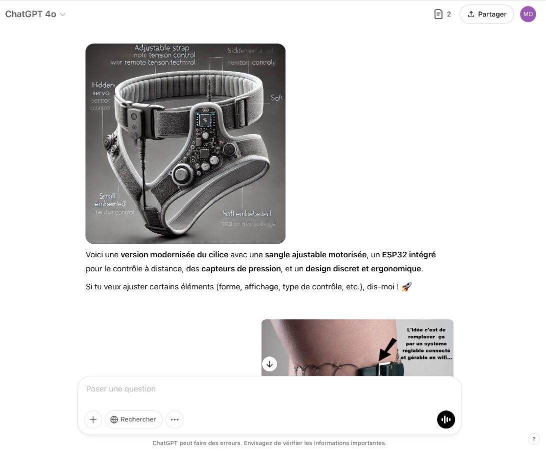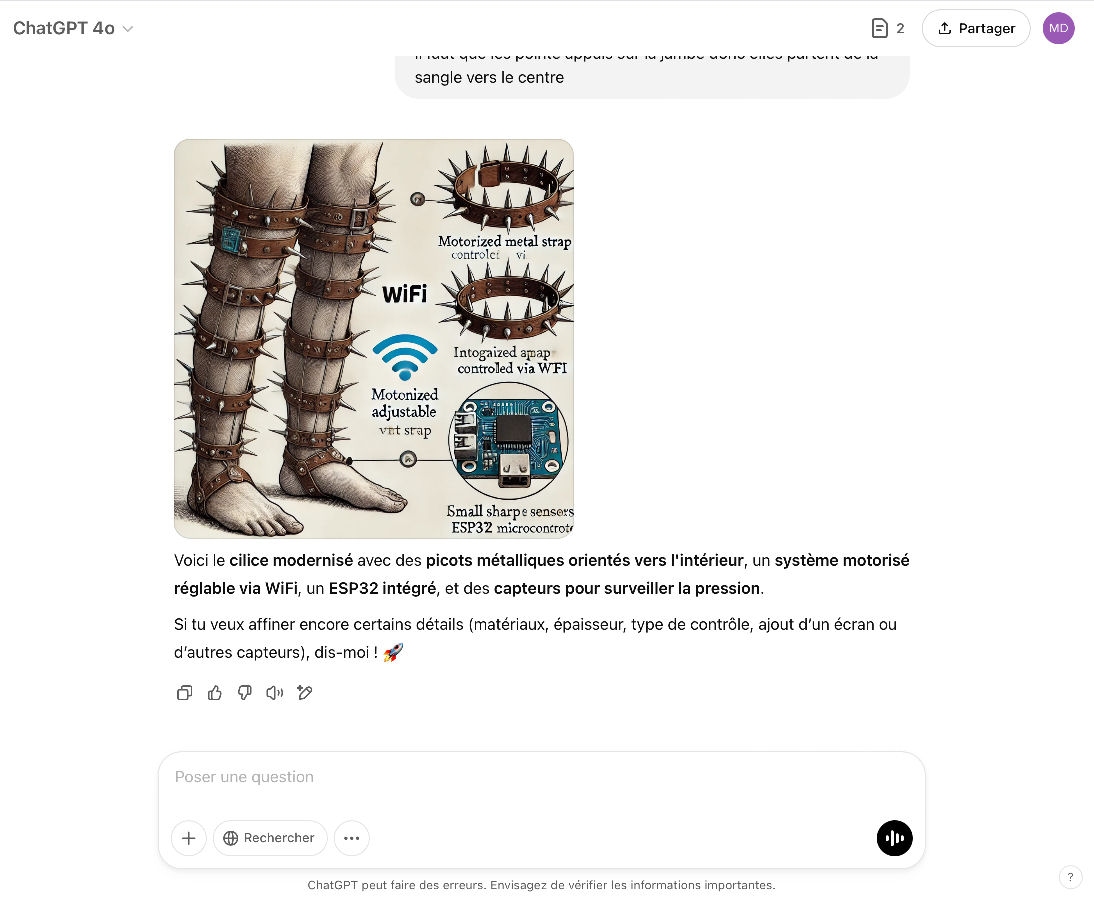 Pour ce que cela vaut, je vous livre mes cogitations lointaines...Il y a un moment déjà, un an ou deux, j'ai eu l'idée de proposer à chatGPT le projet d'un cilice connecté ! Sic ! La réponse de l'IA m'a fait peur à l'époque tellement le projet complet était impressionant et en voici quelques restes... Pourquoi peur...cela m'a semblé si précis que l'dée qu'un Frankenstein reprenne le projet en " vrai " m'a arrêté !